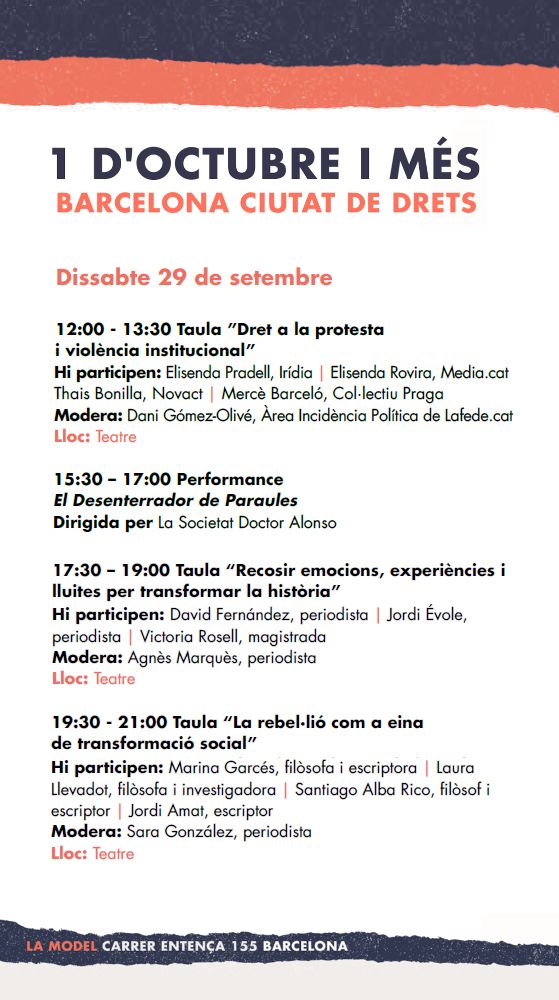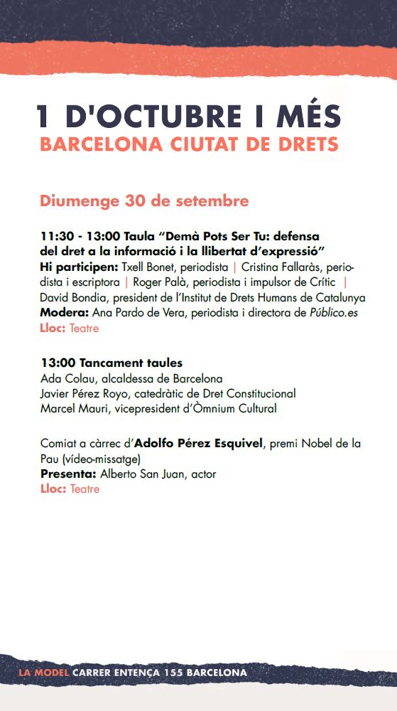 Irídia, junto al Ayuntamiento de Barcelona y las entidades de la campaña #DemàPotsSerTu (#MañanaPuedesSerTú)—NOVACT, Òmnium Cultural, l’Institut de Drets Humans de Catalunya i Fundipau— queremos iniciar una reflexión sobre el significado, las causas y las consecuencias del 1 de octubre de 2017, un año después. El 1 de octubre marca un antes y un después en la vida política y social de Cataluña y también de su capital, Barcelona.