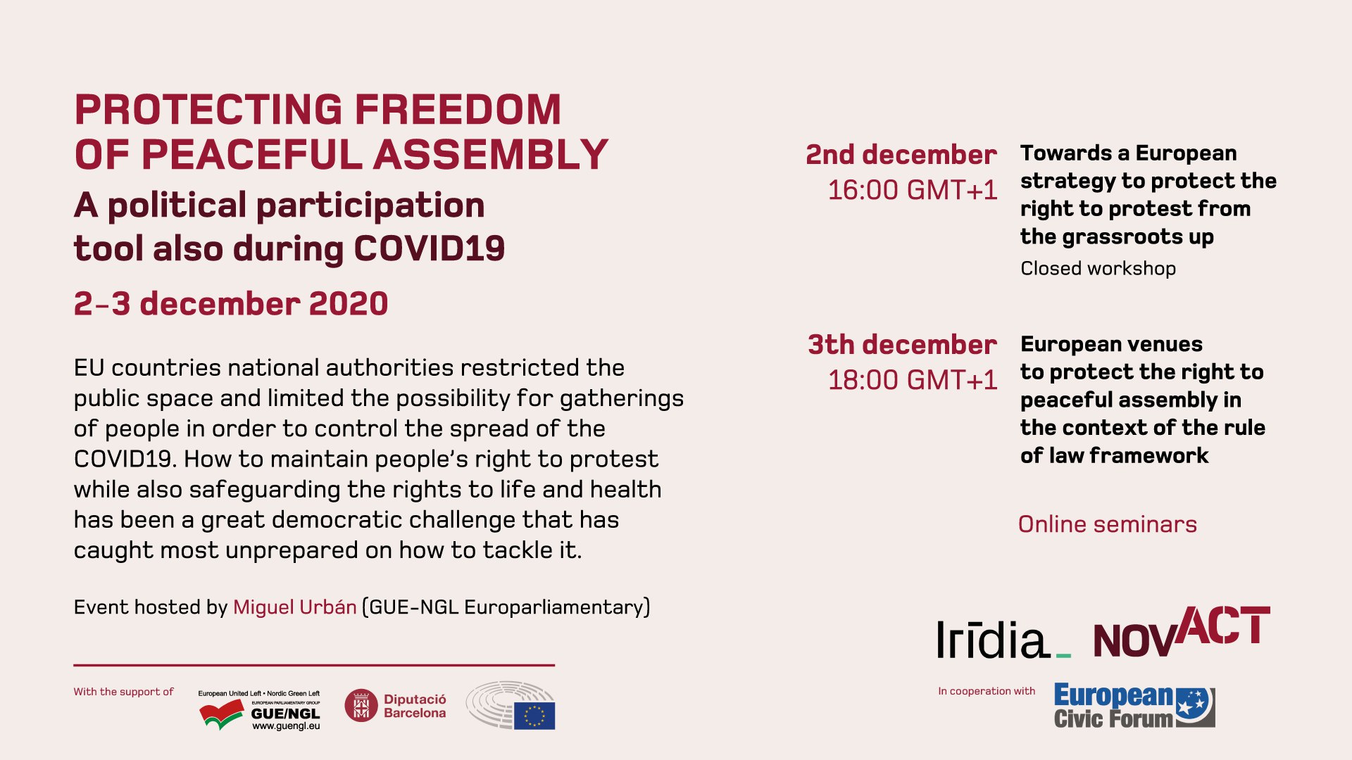 - La segona part, el dijous 3 de desembre de 18:00 a 19:30 i sota el títol Trobada europea per protegir el dret de reunió i manifestació en el context de el marc de l’estat de dret, serà una oportunitat per debatre i compartir amb representants d’alt nivell de la Unió Europea el dret de reunió i manifestació durant la pandèmia de la COVID-19 en el marc de l’estat de dret de la Unió Europea.