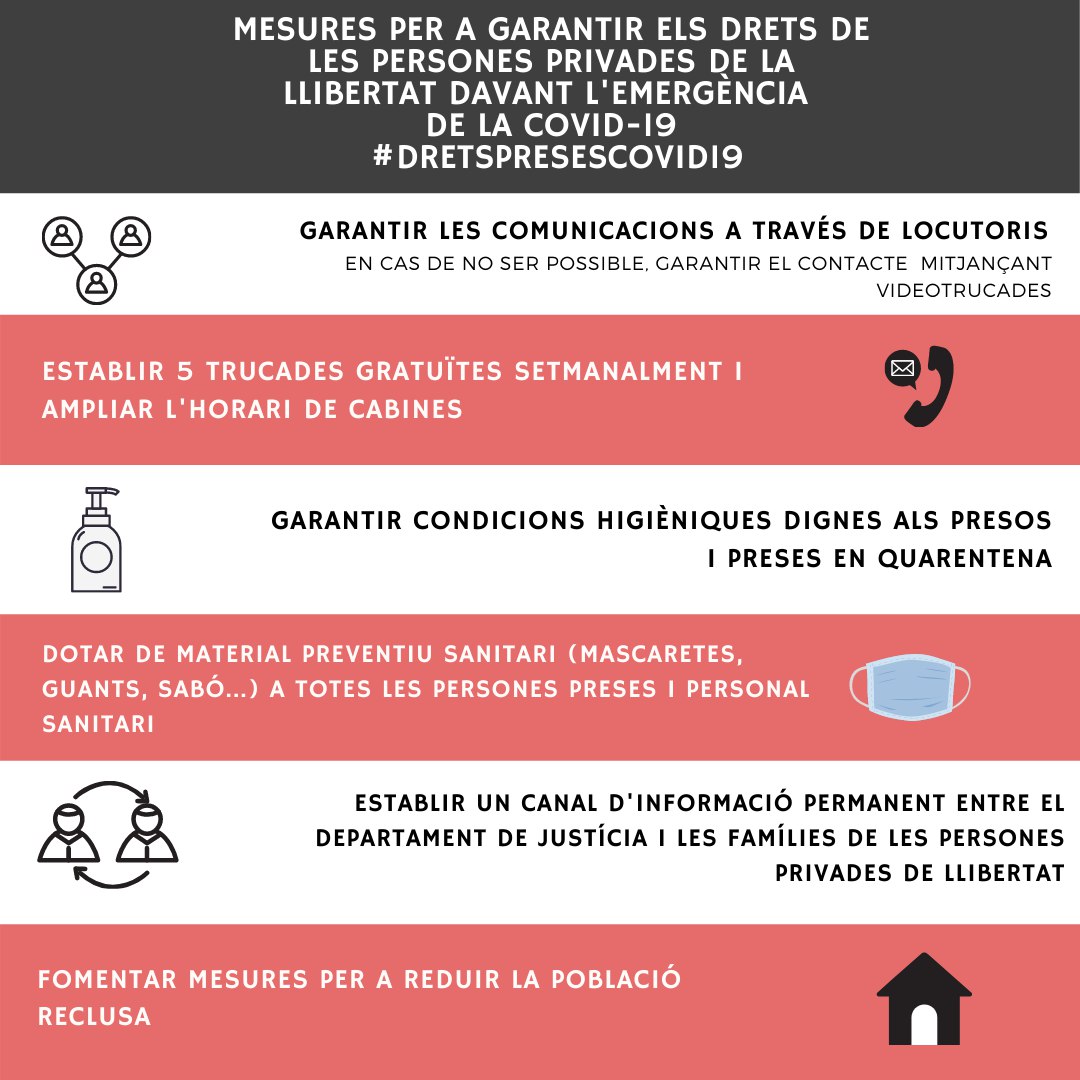 Les peticions van en la línia de garantir la comunicació amb l’exterior de les persones privades de llibertat, assegurant que es poden fer comunicacions a través de locutori o bé a través de trucades i videotrucades. Així mateix, també es sol·liciten mesures tendents a que les persones preses confinades es trobin en condicions dignes i que les restriccions que se’ls apliquen en cap cas derivin en condicions materials de vida d’aïllament.